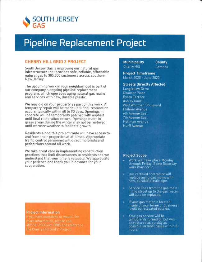 South Jersey Gas is improving their natural gas infrastructure that provides safe, reliable, affordable natural gas to 385,000 customers across southern New Jersey. The upcoming work in the following neighborhoods is part of the company’s ongoing pipeline replacement program, which upgrades aging natural gas main and services with new, durable plastic.